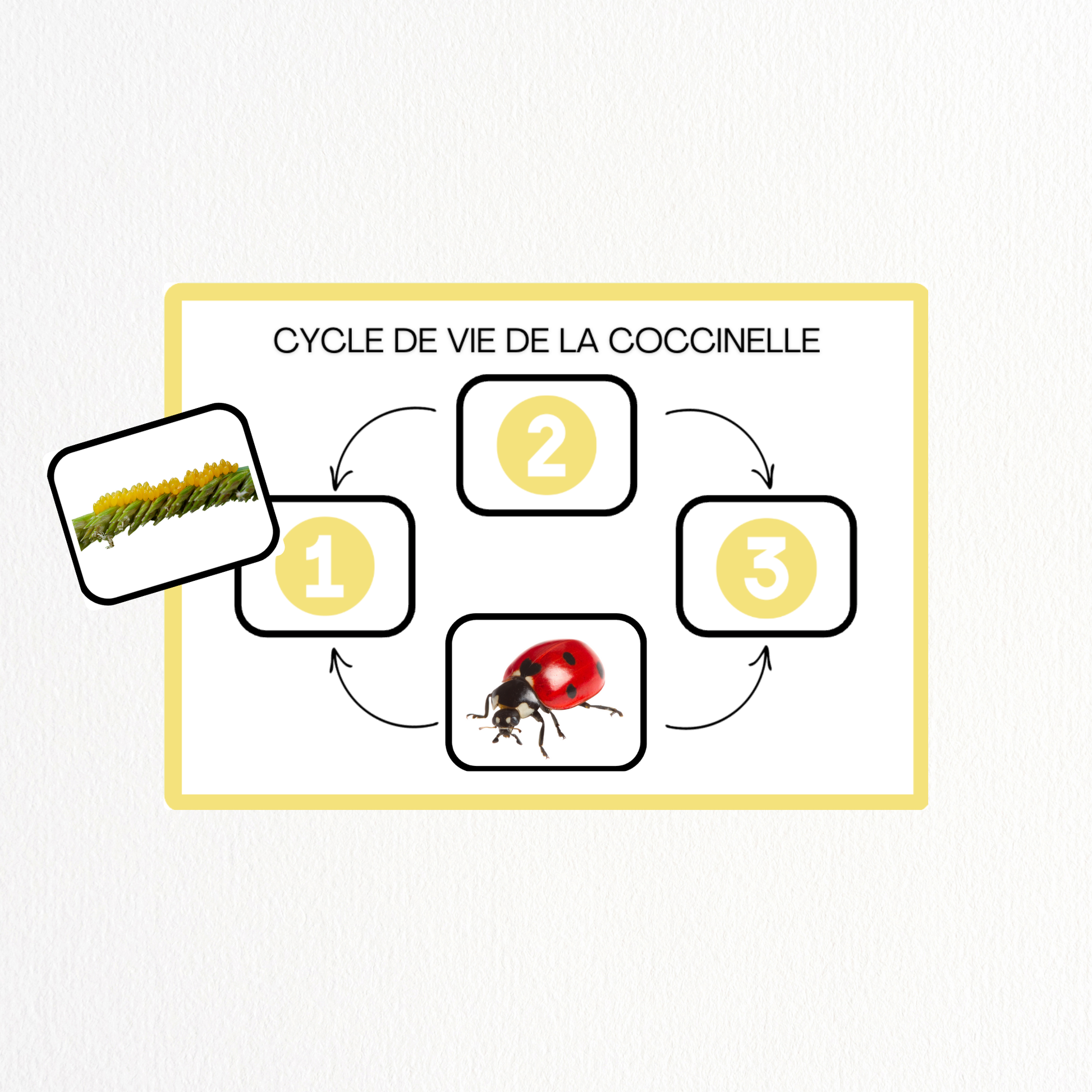 Ce pack d'activités invite l'enfant à découvrir le cycle de vie de la coccinelle, étape par étape.