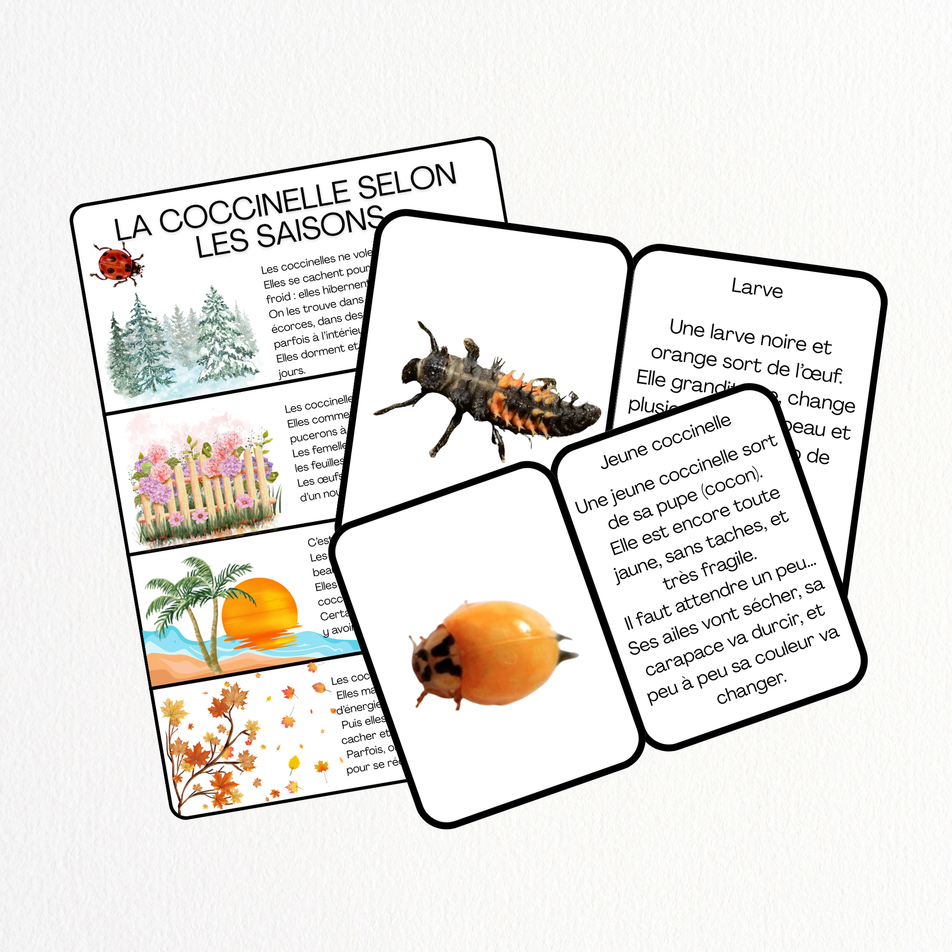 Un grand classique évolutif : image seule, mot, puis lecture complète. Parfait pour faire le lien entre vocabulaire, image et mot écrit. - 🍂 La coccinelle au fil des saisons