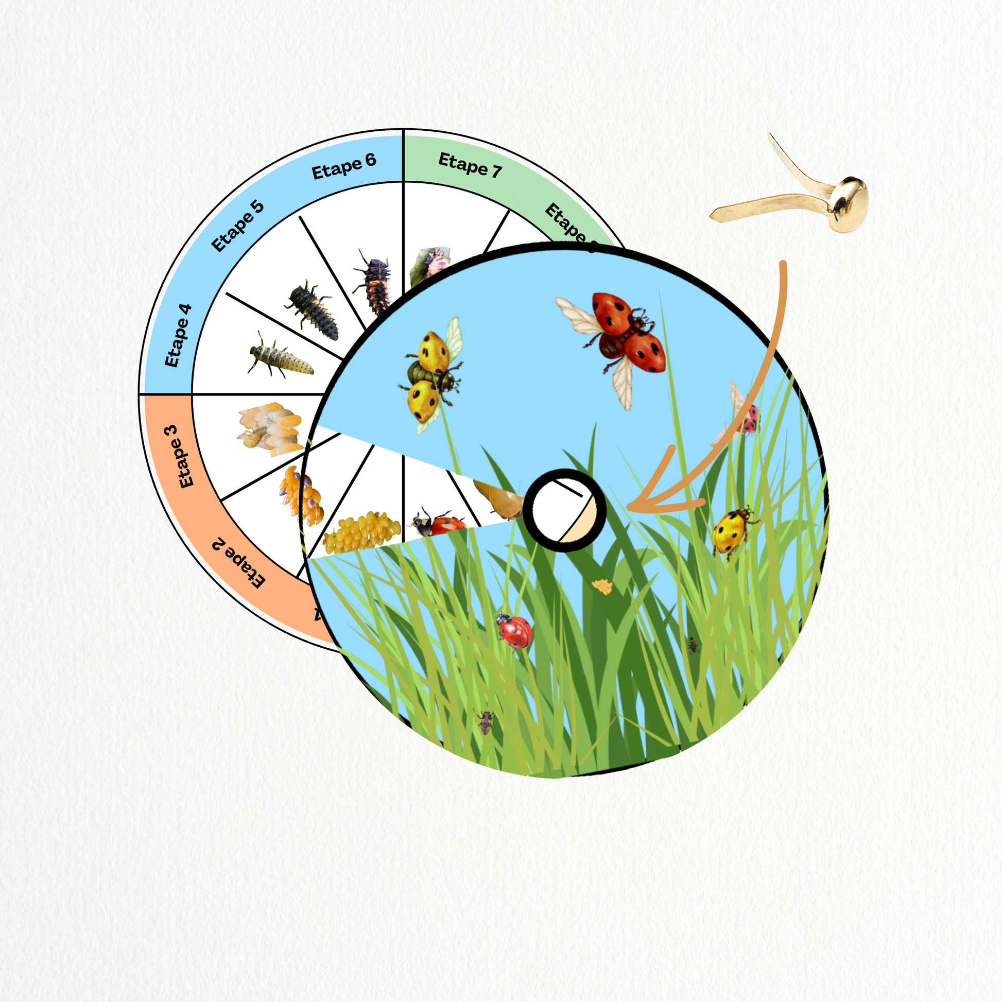 À assembler et manipuler pour faire apparaître les 12 étapes de la vie de la coccinelle, une par une. Un outil ludique et sensoriel pour explorer en détail chaque phase.